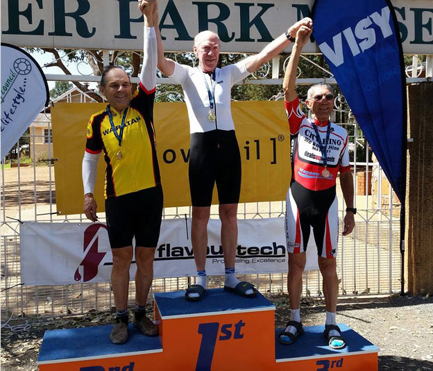 Col Maciver made it a clean sweep today when he added victory in the 18km ITT to his two earlier gold medals at the 2014 NSW State Masters Championships in Griffith this weekend. Racing in Masters 9, Cols time of 27m:02.81s was also faster than the Masters 10, and Masters 7 winning times and would have seen him on the podium for silver in the Masters 8.