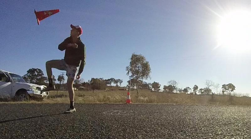 While the action on the road was enthralling, it wasn’t quite as riveting for the marshal at the turn. Cookie, suffering the after-effects of illness, kindly volunteered to do the work which was greatly appreciated by all. Fortunately, thanks to our turn camera, we can also appreciate the emerging cone flipping talents on display. Surely when this becomes an Olympic sport, Armidale will have a serious contender.